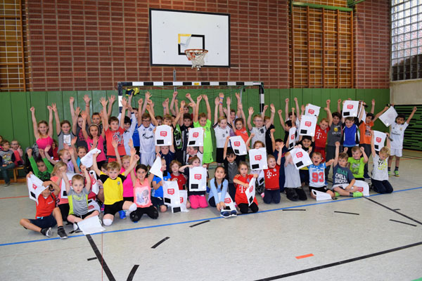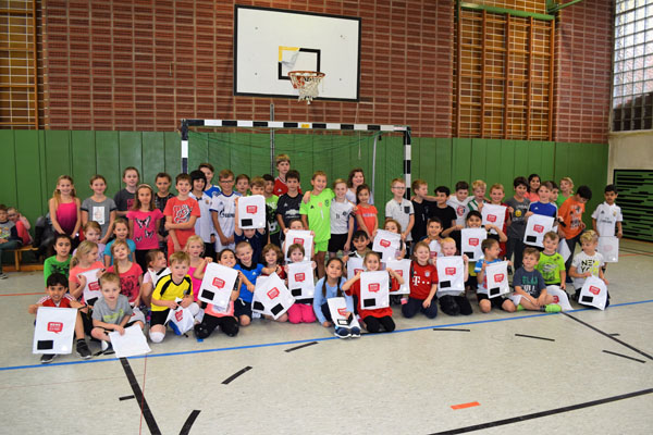 Alle Teilnehmer durften sich über einen Sportbeutel freuen. Für den Sportunterricht erhielt die Schule wieder einen Sack mit Lederfußbällen.